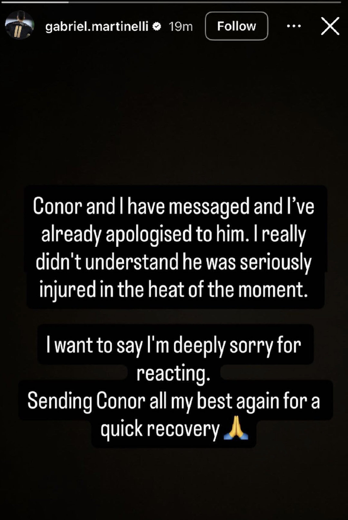 马丁内利随后在个人Instagram快拍上发布致歉声明,强调自己当时并未意识到布拉德利伤势严重:“我和康纳已经通过私信沟通,并且已经向他道了歉。在比赛最后时刻的情绪上头阶段,我真的没有察觉到他受了重伤。”