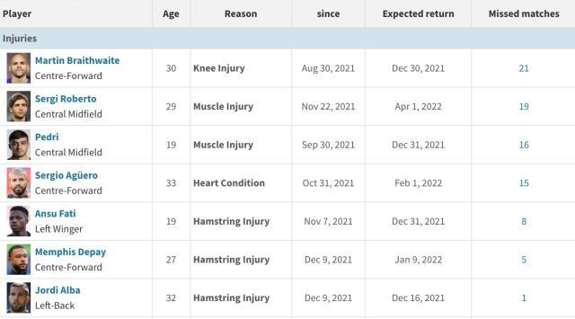 在周中欧冠遭到重创后,本周日巴萨将回到联赛客场挑战与自己排名仅差2分的奥萨苏纳。对巴萨来说坏消息是,球队的最佳射手孟菲斯·德佩在对拜仁的比赛受伤,将缺席本场联赛,加上对拜仁半场不到就伤退的阿尔瓦,本轮联赛巴萨的伤停名单上有多达7人:孟菲斯、法蒂、阿尔瓦、塞尔吉·罗贝托、佩德里、布雷思韦特、阿圭罗。
