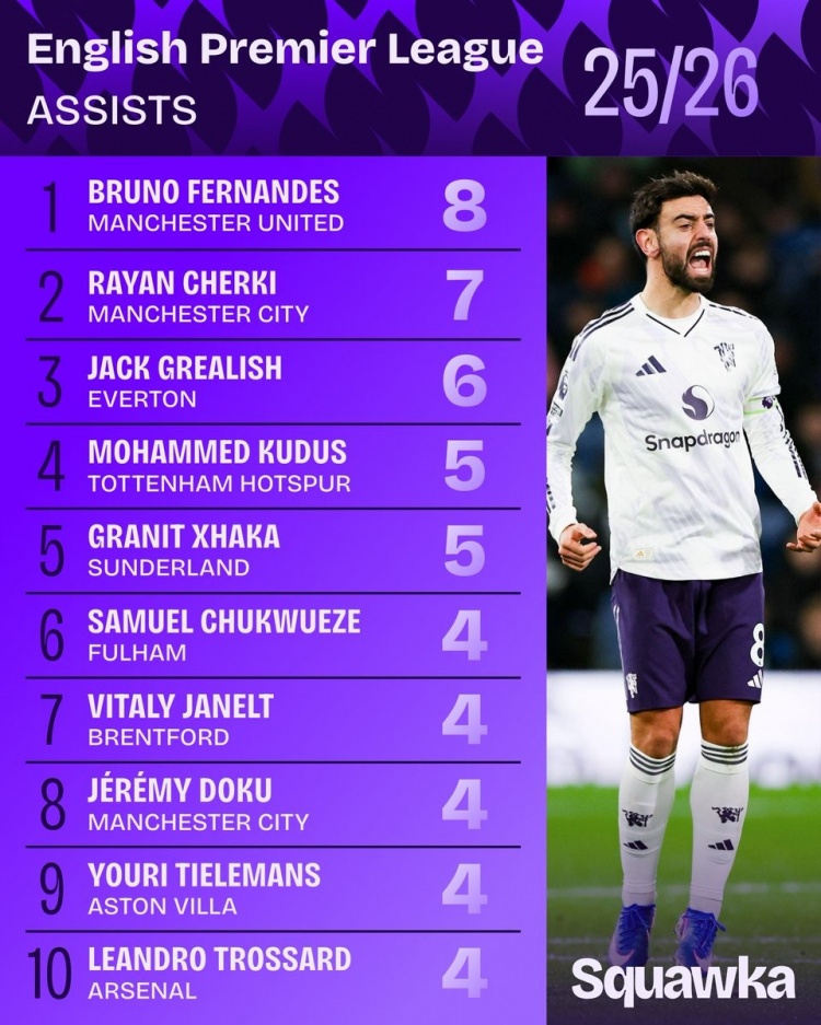 1月10日讯 数据机构squawka统计了本赛季英超助攻情况,B费居首。